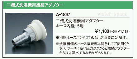 商品の規格と特徴■INAX 二層式洗濯機用接続アダプター A-1897※送料無料商品と同梱の場合は送料無料となります。※別途ホースバンド(市販品)が必要になります。※洗濯機側のホース接続部は開放してご使用下さい。※二槽式の場合でも水栓金具との接続部材が用意されている場合は不要です。 INAX 二槽式洗濯機用アダプター A-1897INAX イナックス A-1897